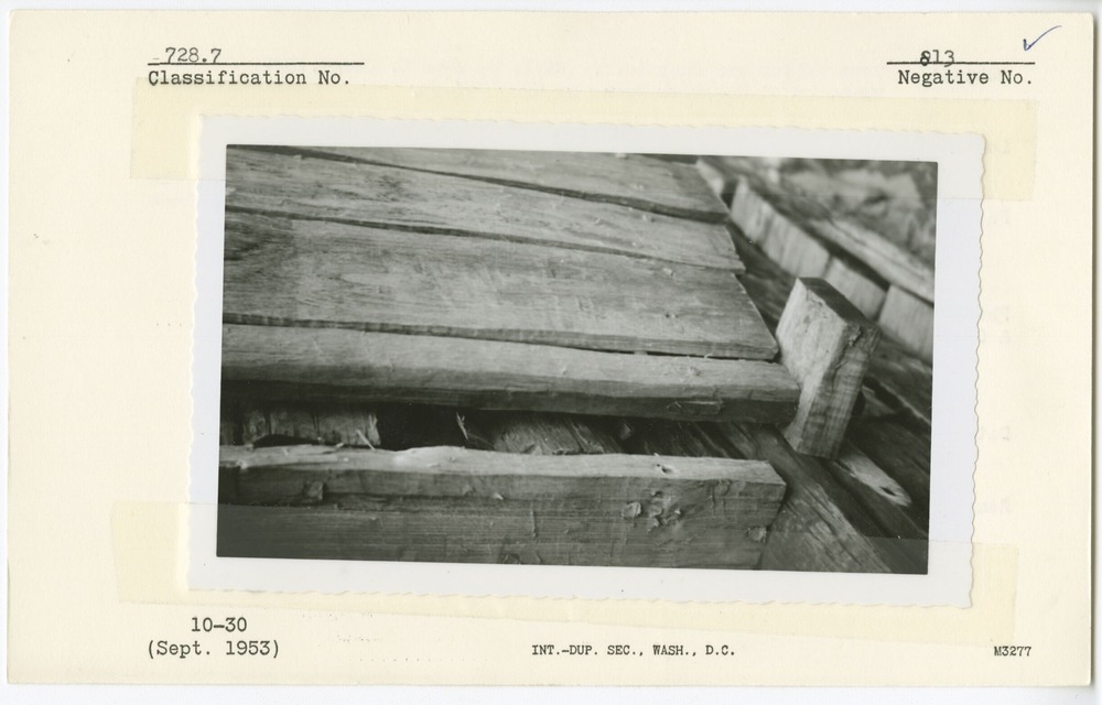 Detail of bottom hinge and door jamb. The pintle on the end of the hinge sets in a hole in the hinge block. A long tenon on the hinge block is mortised thru the log and pinned. Built by John C. Clark, 1881. Restored at Humpback Rocks by NPS, 1952-53