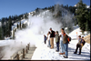 Hikers looking at steaming hydrothermal features at Sulphur Works with snow on the ground.