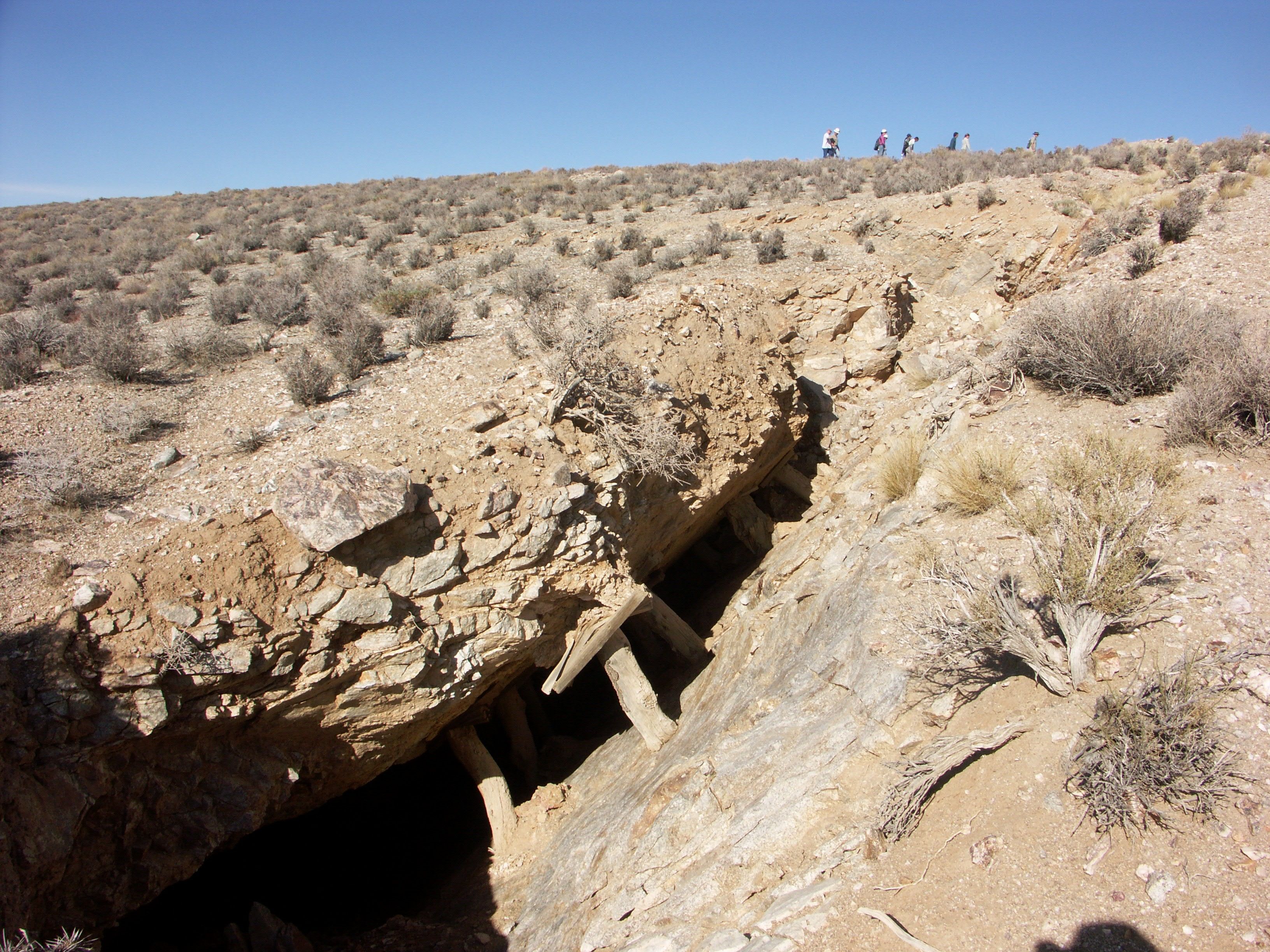 Open stope with wood stulls for bracing, Skidoo Mine. Abandoned Mine Safety class on ridge in background. Skidoo Mine, Death Valley National Park, November 2008.