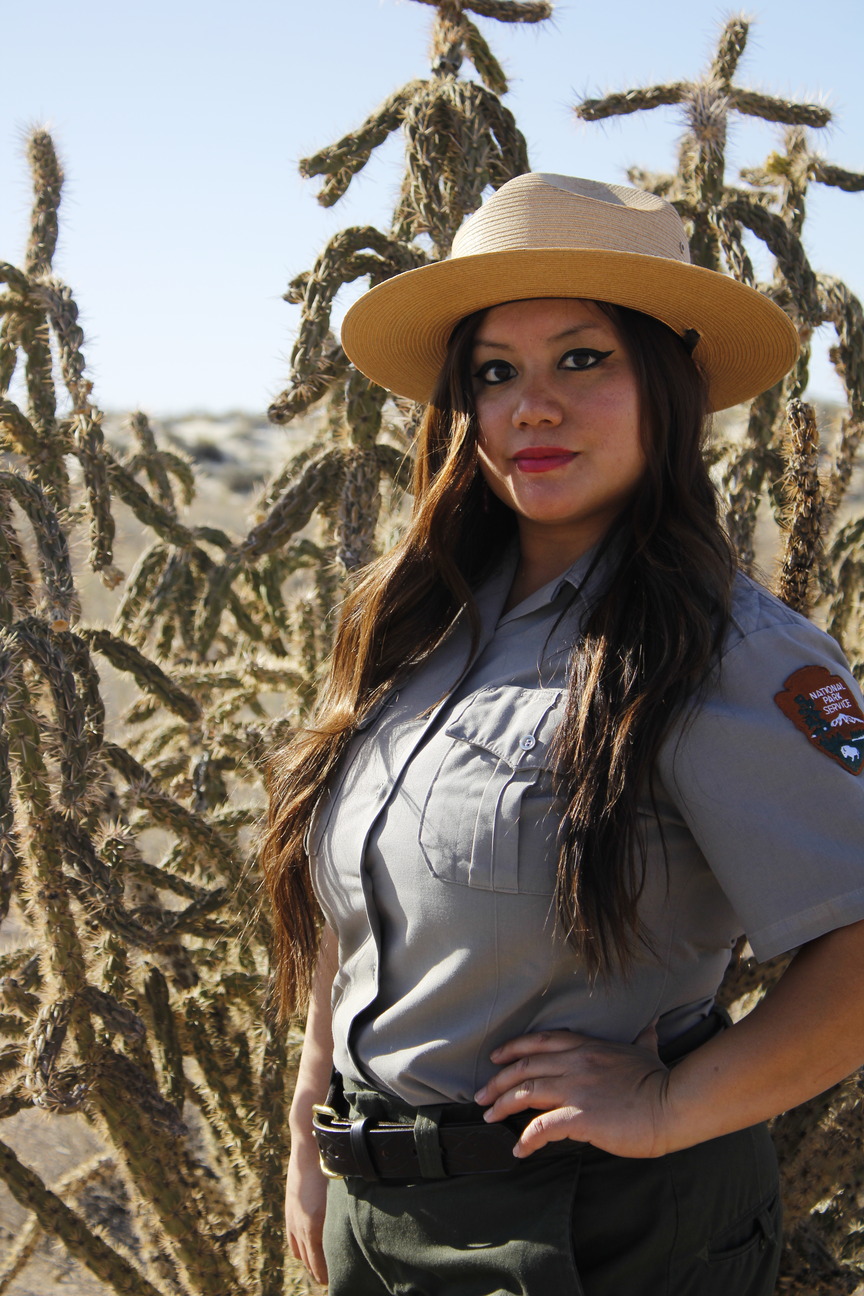 A woman in the NPS uniform poses for a photo. Cholla cactus and desert shrubbery extend into the background meeting white sand dunes under a pale blue sky.