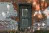Closeup view of wooden door with metal slates to a brick structure.