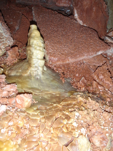 A stalagmite on the ground with reddish calcite crystal breakdown in background