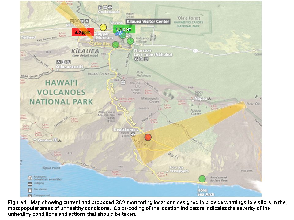 Update SO2 monitoring system in Hawaii Volcanoes NP. Map of curren and proposed monitoring stations, photo of VOG plume and Diagram of alert system