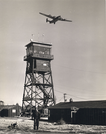 Black and white photo of a control tower with a plane flying overhead and a man in the foreground