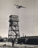Control Tower on Casper Army Air Base with a B-24 Bomber flying overhead. Official photo of the U.S. Army Air Forces. Building sign reads: “Base Flight and Alert Crew.”