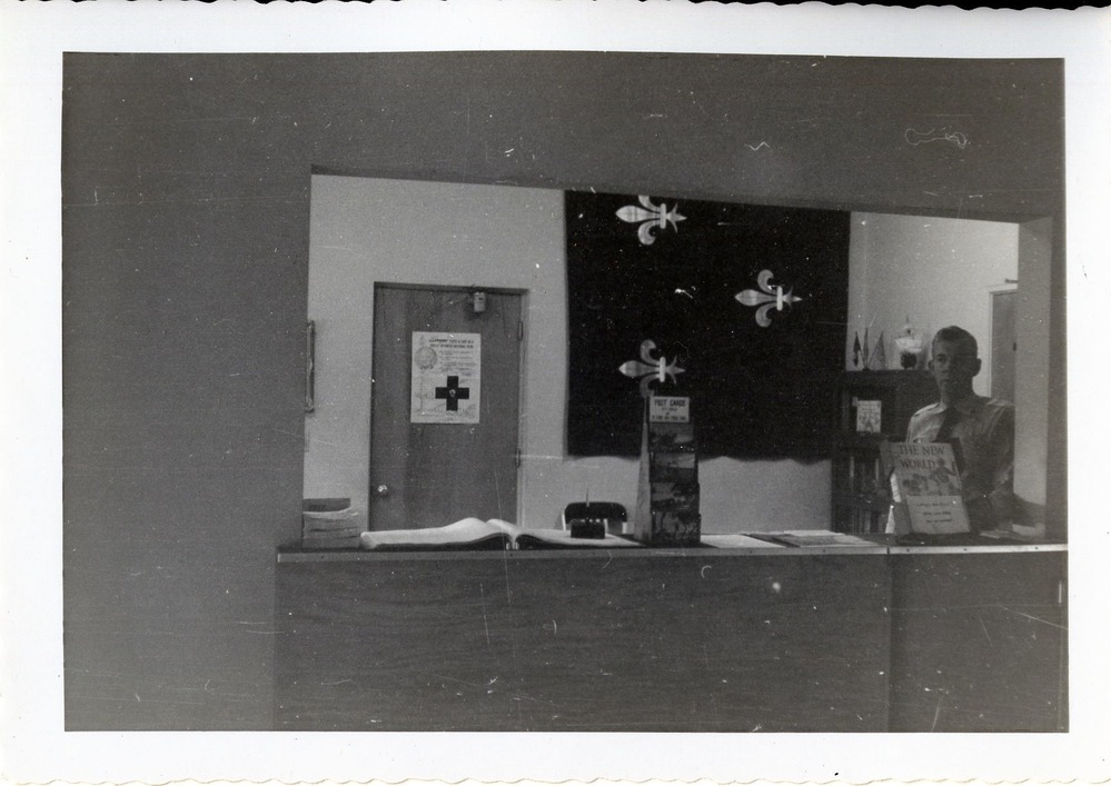 a park ranger standing behind a desk on the wall hangs the historic French flag