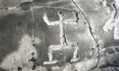 A black and white image of a human-figured petroglyph carved onto a large smooth rock.