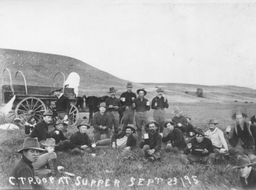 Troop C, 2nd Cavalry, eating supper near Fort Riley, Kansas on September 23, 1895. This copy photoprint was made in May 1962 from an original print loaned by Emma Nuckolls. ; September 23, 1895