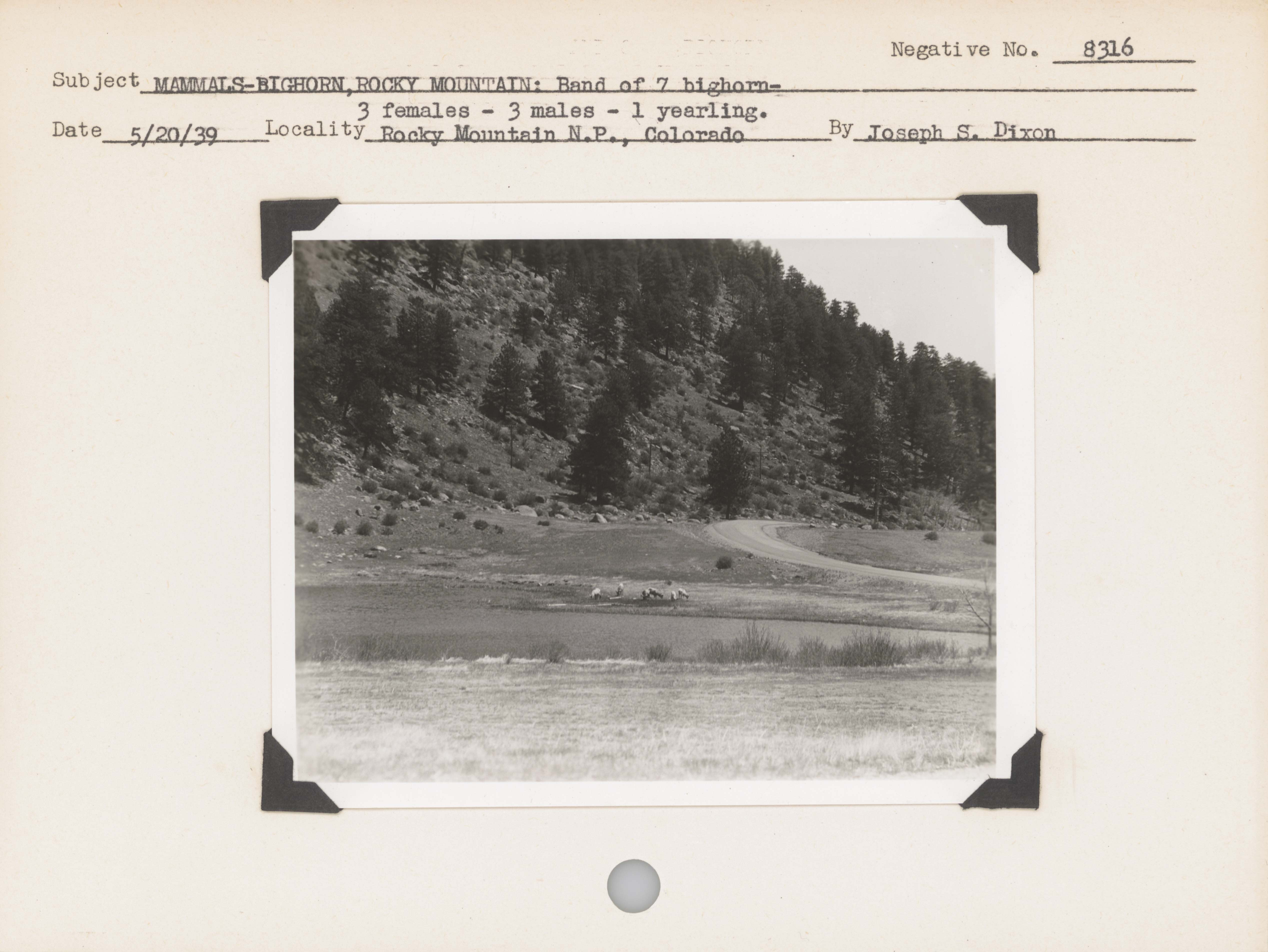 Mammals--Bighorn, Rocky Mountain--Band of seven bighorn-three female-three male-one yearling. Locality: Rocky Mountain National Park, Colorado. Negative #: 8316