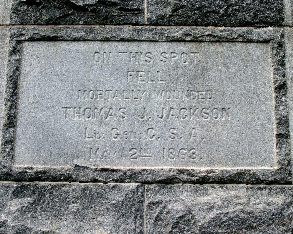 Monument erected by private individuals & some of Stonewall Jackson's troops to comemerate spot where Jackson fell, wounded by his own troops May 2, 1863. Situated in the Chancellorsville Battlefield. || 2 part stepped base of rough-cut, coursed stone & tooled edges, 7'sq at bottom. Shaft of rough-cut, coursed stone & tooled edges, 5'sq tapering to 3'6", w/ polished inscribed faces on 4 sides. Cap: ogee & pryamid. Overall 14'H.