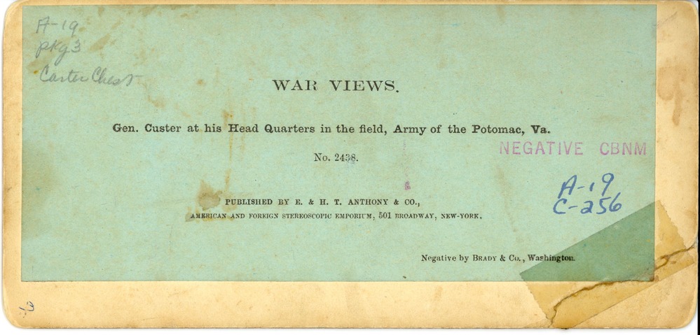 LIBI_00019_00256; This item is an albumen stereograph (card-mounted photograph) of General George A. Custer seated in front of his Virginia field headquarters with a dog. The stereograph is 3 1/4 x 7" mounted on a yellow mount and was produced circa 1863. The negative was produced by Brady & Co. of Washington and was published by E. & H.T. Anthony & Co. as part of a series of images titled, "The War for the Union." On the front, typed captions on the left and right side of the image read, "Photographic History/The War for the Union." On the verso, a typed notation reads, "War Views./ Gen. Custer at his Head Quarters in the field, Army of the Potomac, Va." The publisher's stamp is also printed on the verso.Note: "Pkg 3/Custer Chest" handwritten on the verso. Photograph reprinted in "The Custer Album" by Lawrence A. Frost, page 56, and "Custer in Photographs" by D. Mark Katz, page 6.; STEREOGRAPH [Stereoscopic card photograph]; Courtesy of the National