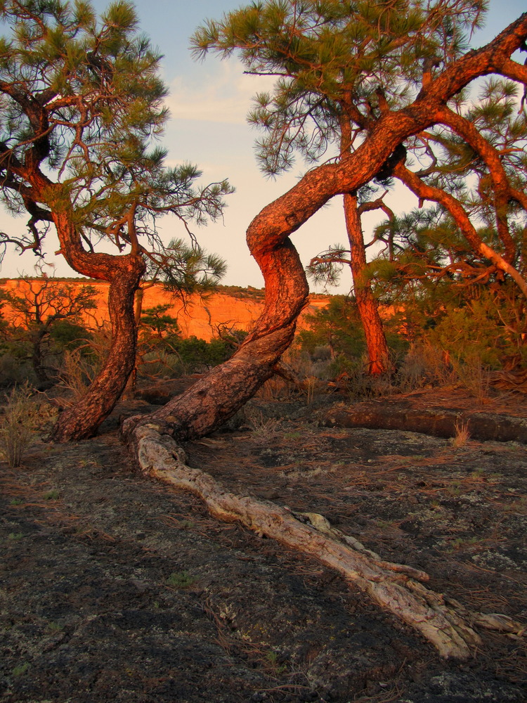 Two pine trees twist upwards and away from each other as they grow up from black rock. The closest tree has a root growing across the rock surface towards the viewer. An orange glow from a sunset lights up a sandstone cliff behind the trees.