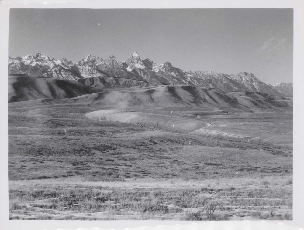 Scenery: Herd of elk raising dust cloud on overgrazed slopes, National Elk Refuge. Negative #: 10962. Location: Near Jackson Hole National Monument [Grand Teton National Park]. Location of negative: Director’s Office. [This information comes from the reverse of the envelope for this negative number.].