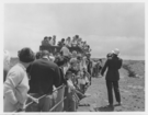 Black and white. A large group of people standing by a fence listening to a man with a bullhorn give a presentation