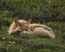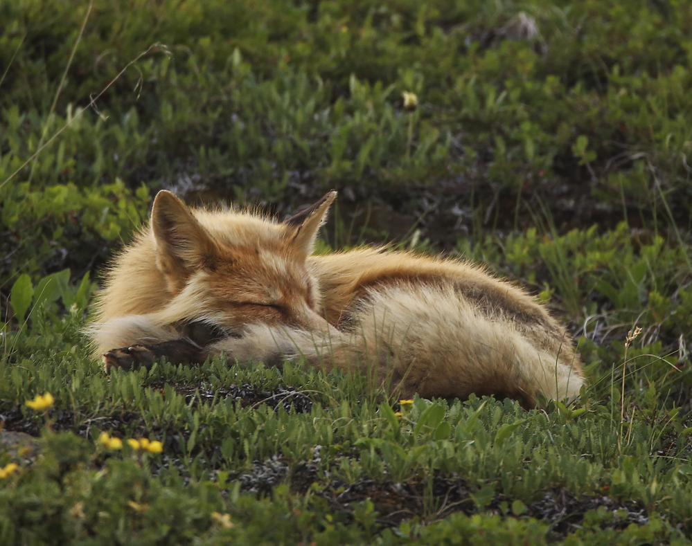 A red fox takes a nap near Eielson Visitor Center in Denali National Park and Preserve on June 29, 2019.