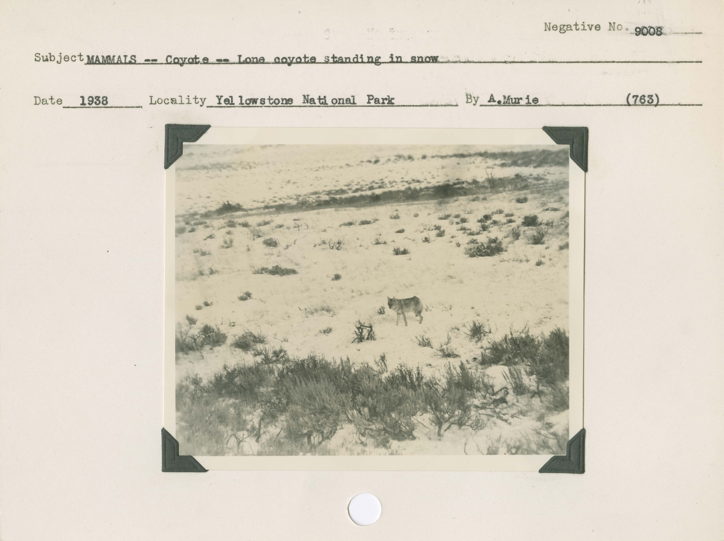 Mammals – Coyote – Lone coyote standing in snow. Locality: Blacktail Deer Creek, Yellowstone National Park. Negative #: 9008. Location of Negative: San Francisco. [Some of this information comes from the reverse of the envelope for this negative number.].