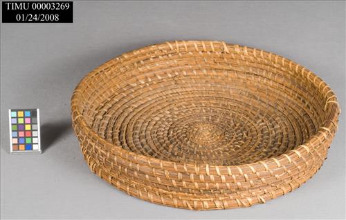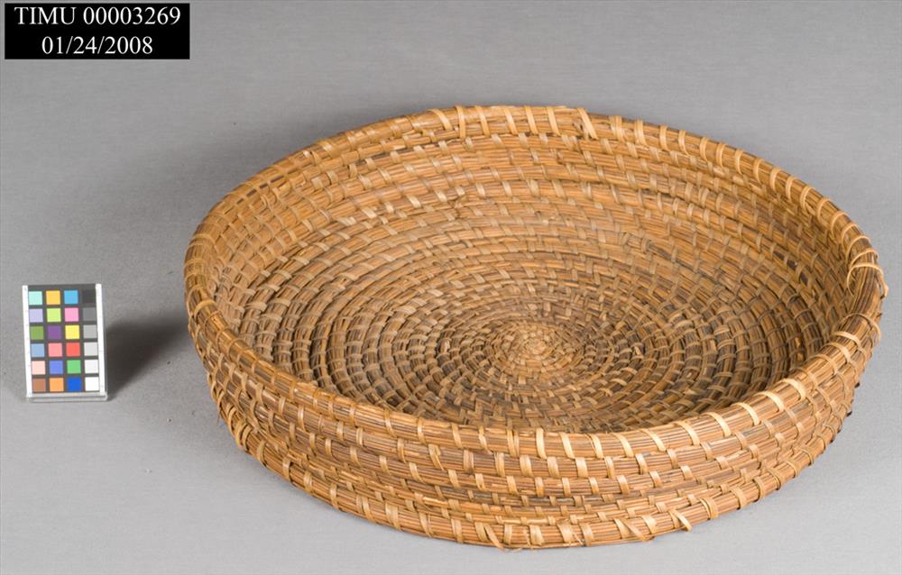 Lg, circ basket made using bundle of pinestraw wound in coil. The bot portion of<CRbasket is flat & consists of 21 concentric circles. Sides of basket wound perpend to the b<CRott part & consist of 6 circ. Bundle & coil fastened togeth w/strips of caining altern w/<CRea circle. Exter bott of bask has a 2nd bundle pinest fasten ard perimeter to form lip. Ge<CRn 1st impress.is that sides are straight up & down, tho actually top slightly wider than<CRbase. Bask gen good cond tho some of caining is loose or missing.