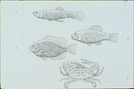 The detritus-eating animals are fed upon by larger carnivores such as (top to bottom) a Mosquito fish, Killifish, Spotted sunfish, and Blue crab.