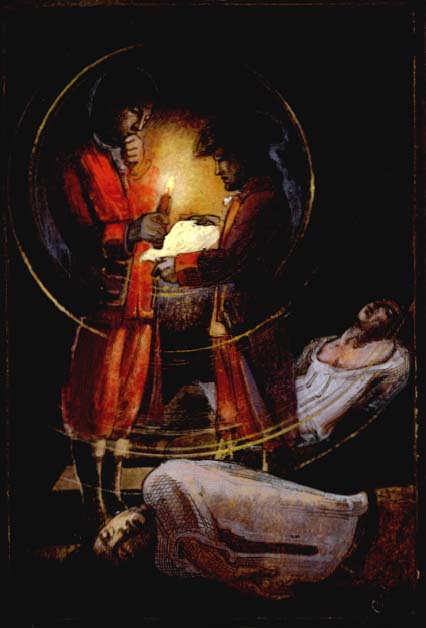 Captain Jacob Van Braam and Colonel George Washington review surrender proposal presented by Captain Louis Coulon de Villiers, commander of the French forces.