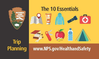 Side 1 of brown and black take away cards on the 10 essentials – with correlating images of a map, sunscreen, jacket, flashlight, first aid kit, match sticks, pocket knife, an apple, water bottle and a tent