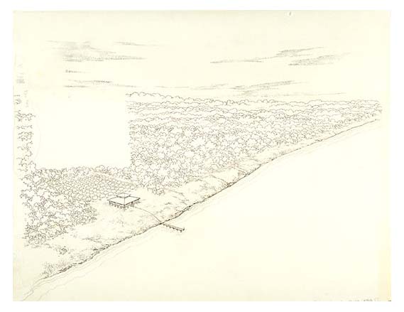 Aerial view of a pineapple or lime plantation home on a berm with a large cleared hammock area planted with orchards behind the berm.