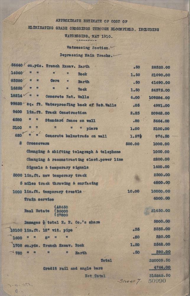 50990.PB#001--Approximate estimate of cost of eliminating grade crossings through Bloomfield including Watsessing [1910.05]