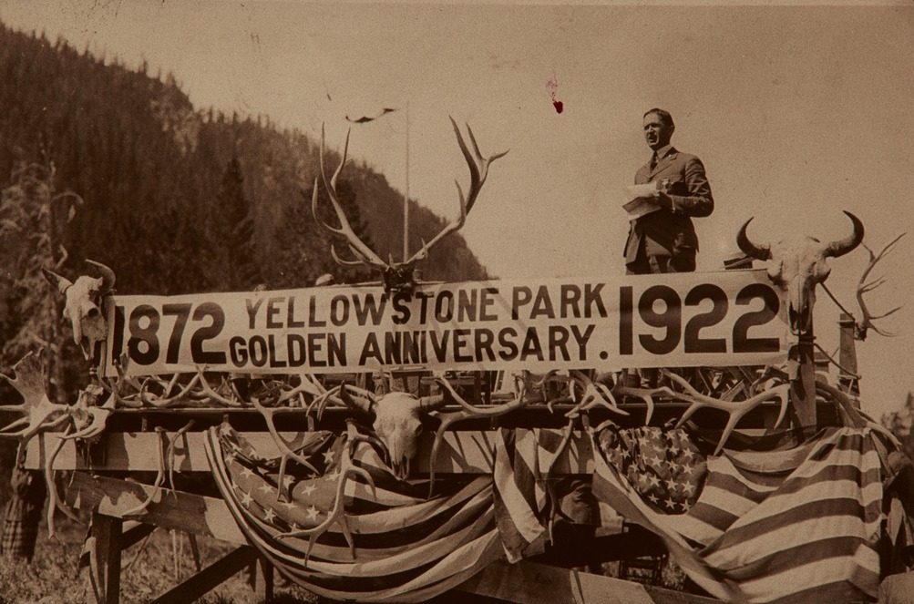 NPS Director Horace Alright givigin a speech from a stage with a sign celebrating the Yellowstone Golden Anniversary in 1922.