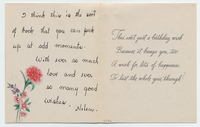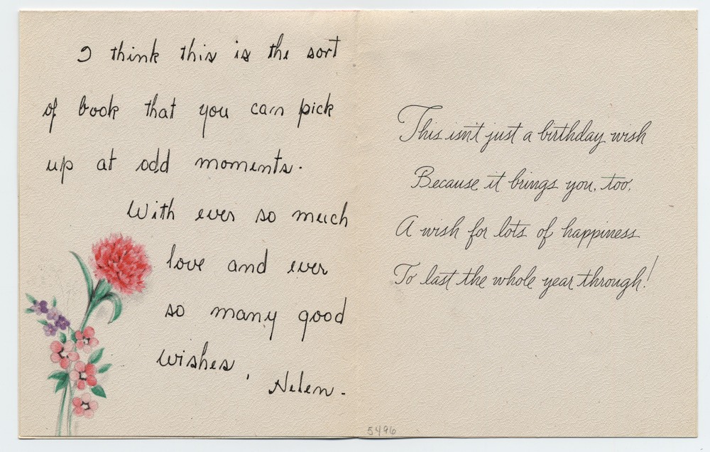 A birthday card with no with no recipient name. The card is signed Helen. The birthday card with pink and purple flowers on the front. Inside, on the left is a handwritten note from Helen and on the right is a printed poem.