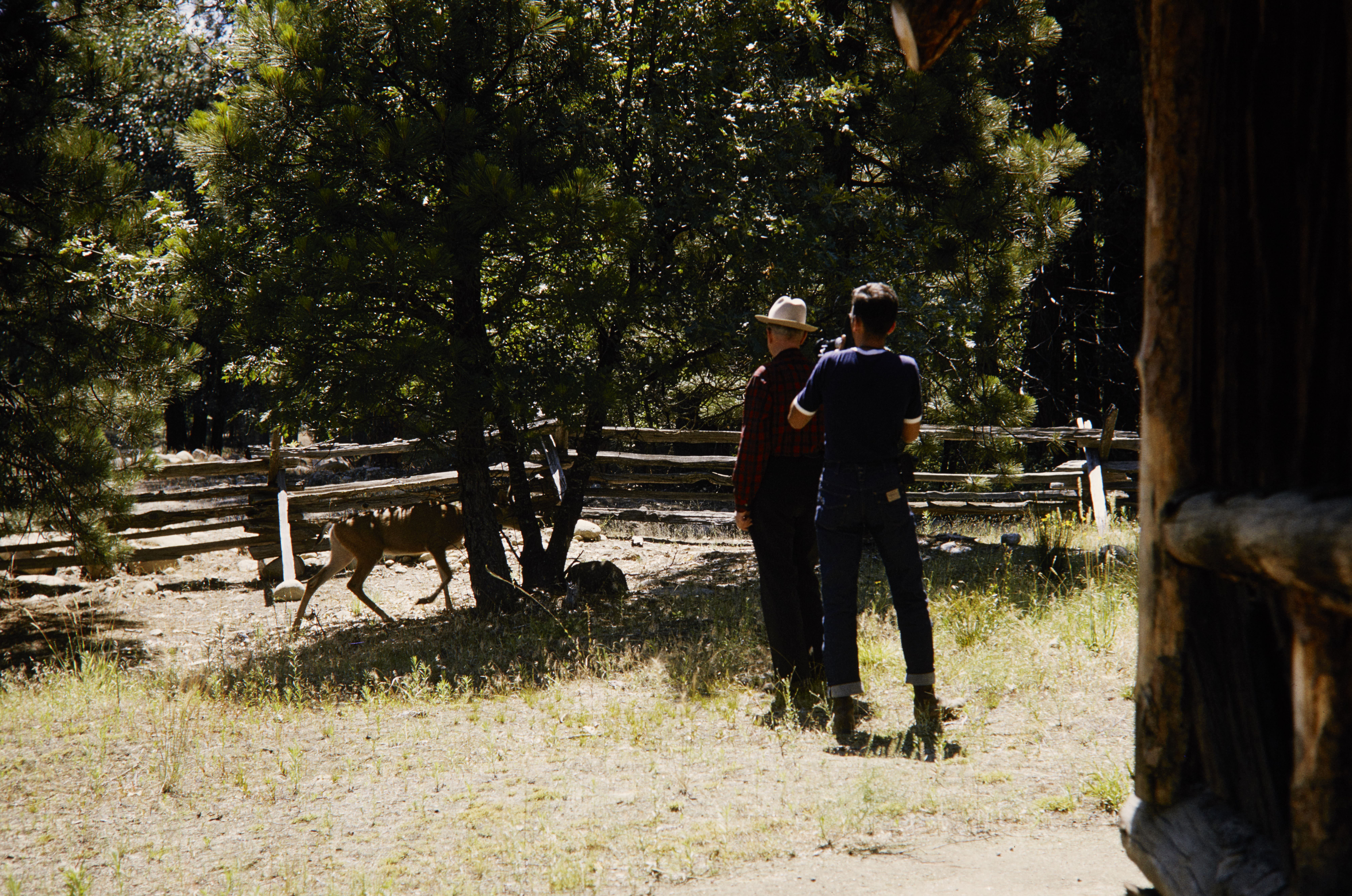 NPS director Horace Albright looking at a deer behind a tree with a film crew member standing behind him.