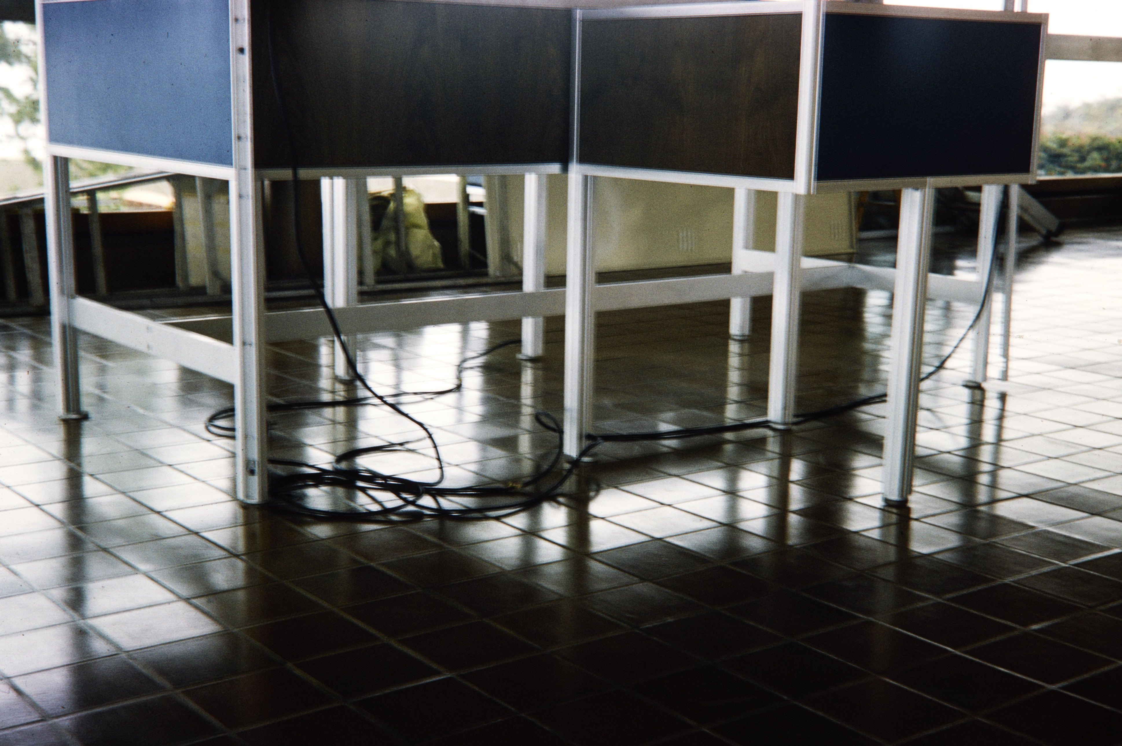 Close-up of table with wires coming out of it in a building in Cabrillo National Monument.