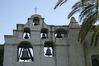 The bells of a historic, white adobe church with a small metal cross on the top.