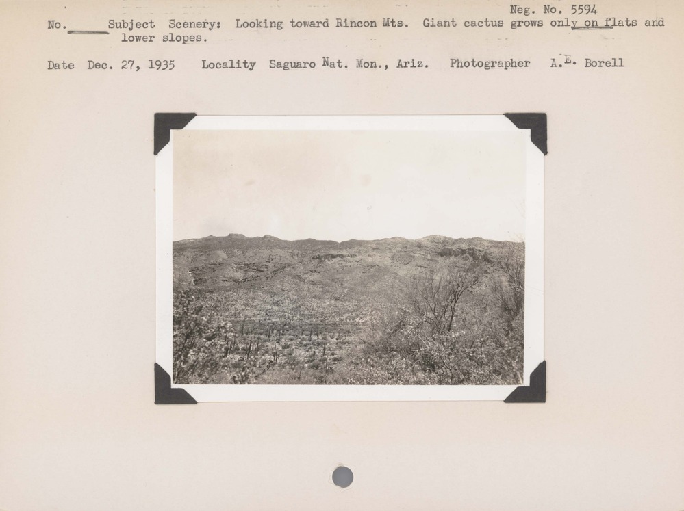 Scenery – Looking toward Rincon Mountains, Giant Cactus grows only on flats and lower slopes. Negative#: 5594. Location: Saguaro National Park, Arizona.