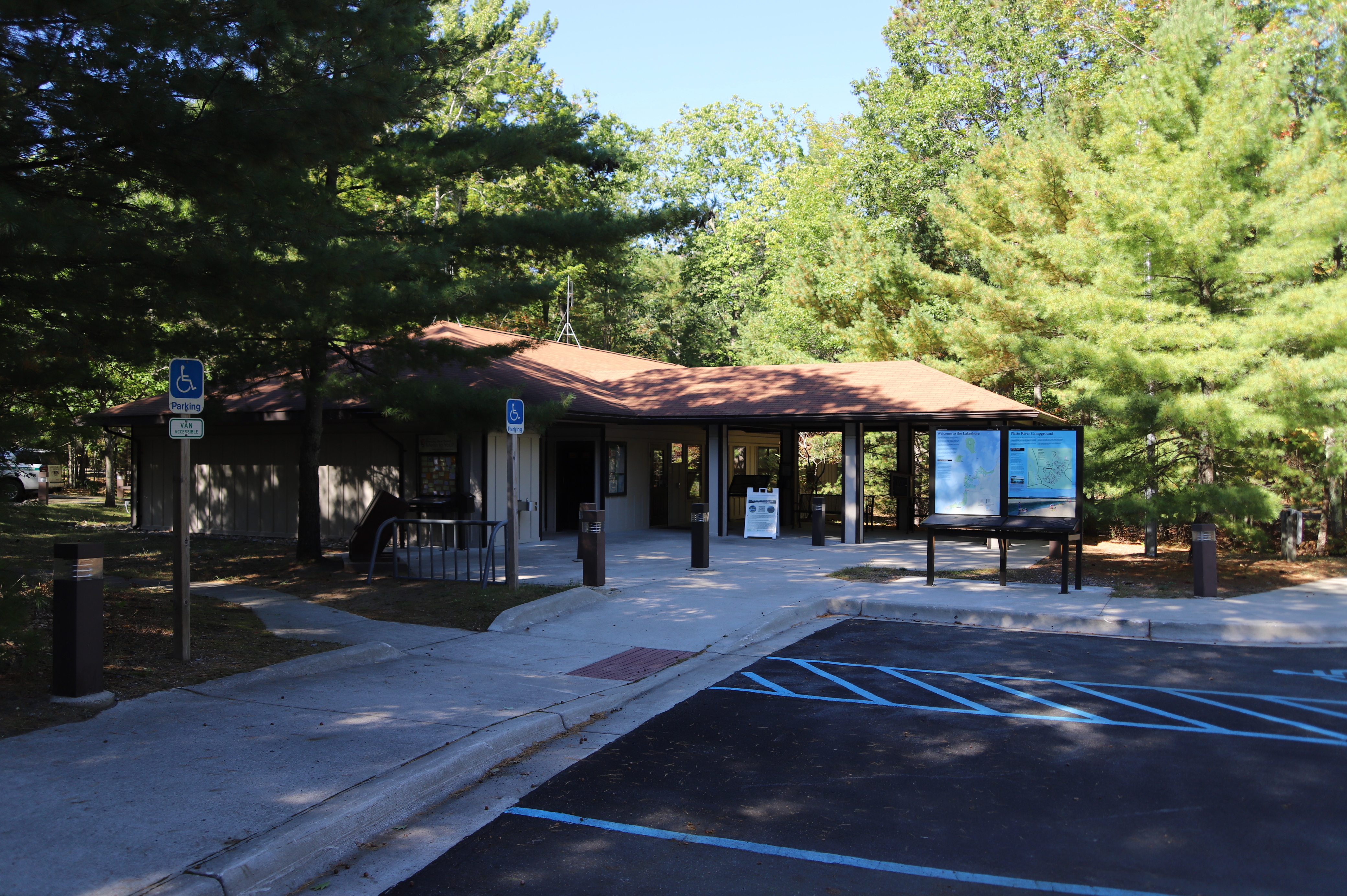 A tan building with a brown shingled roof is surrounded by green trees. There is a black paved parking area and concrete sidewalk in front of the building. Visitor Information panels stands in front of the building.