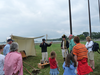 A man dressed as a sailor from the War of 1812, navy blue coat partially buttoned with white and blue striped shirt, white pants, and a black painted hat, stands in the center of the picture with hands out front as if holding something 24 inches long between them. At his feet is a small table with various shot fired from naval artillery. He is surrounded by a group of people ranging in age young to old.
