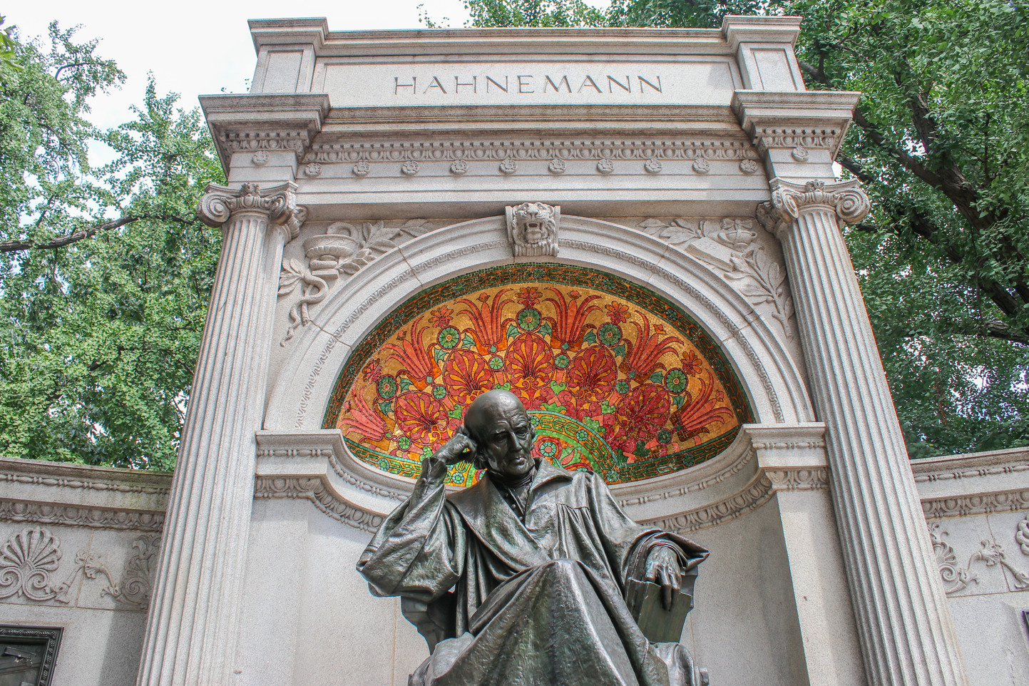 A seated statue of Hahnemann in an exedra and niche of decorative ceramic mosaic art, above inscription reads "Hahnemann."