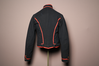 Color image of the back of a field artilleryman Civil War uniform shell jacket. Jacket is navy blue with orange piping on the collar, sleeve cuff, back side seams, and bottom hem. Two small gold metal, circular buttons accent each of the sleeve cuffs. Jacket is a woolen texture.