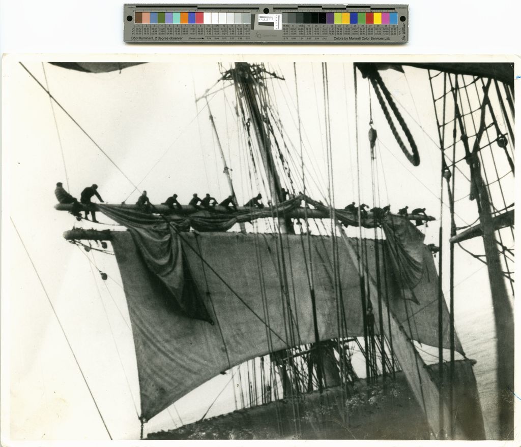 Moshulu (bark, 4m) view aloft of crew members bending an upper topsail while at sea, undated