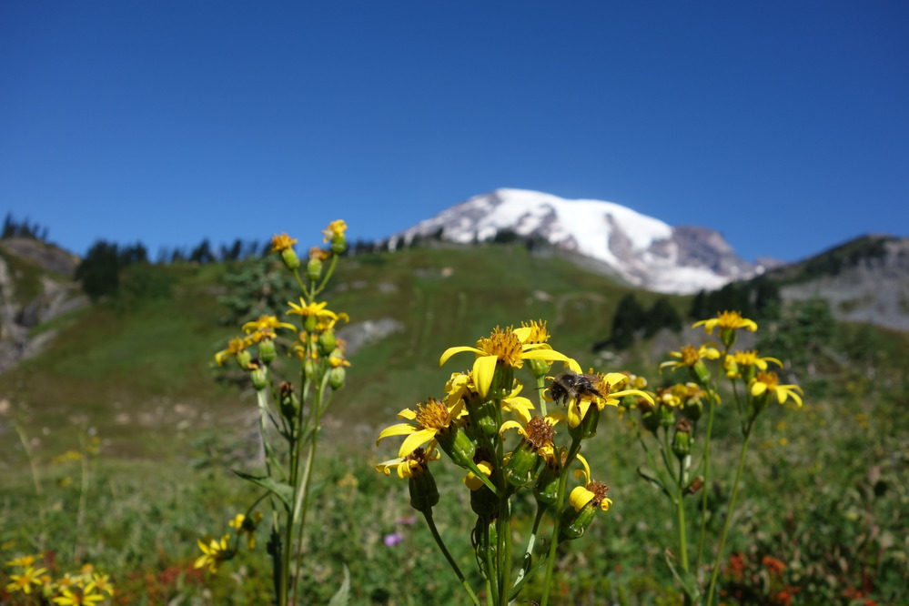 Late season wildflowers make the most of every day of sunshine before the fall rainy season. These arrowleaf groundsel wildflowers are blooming even as they start to go to seed.