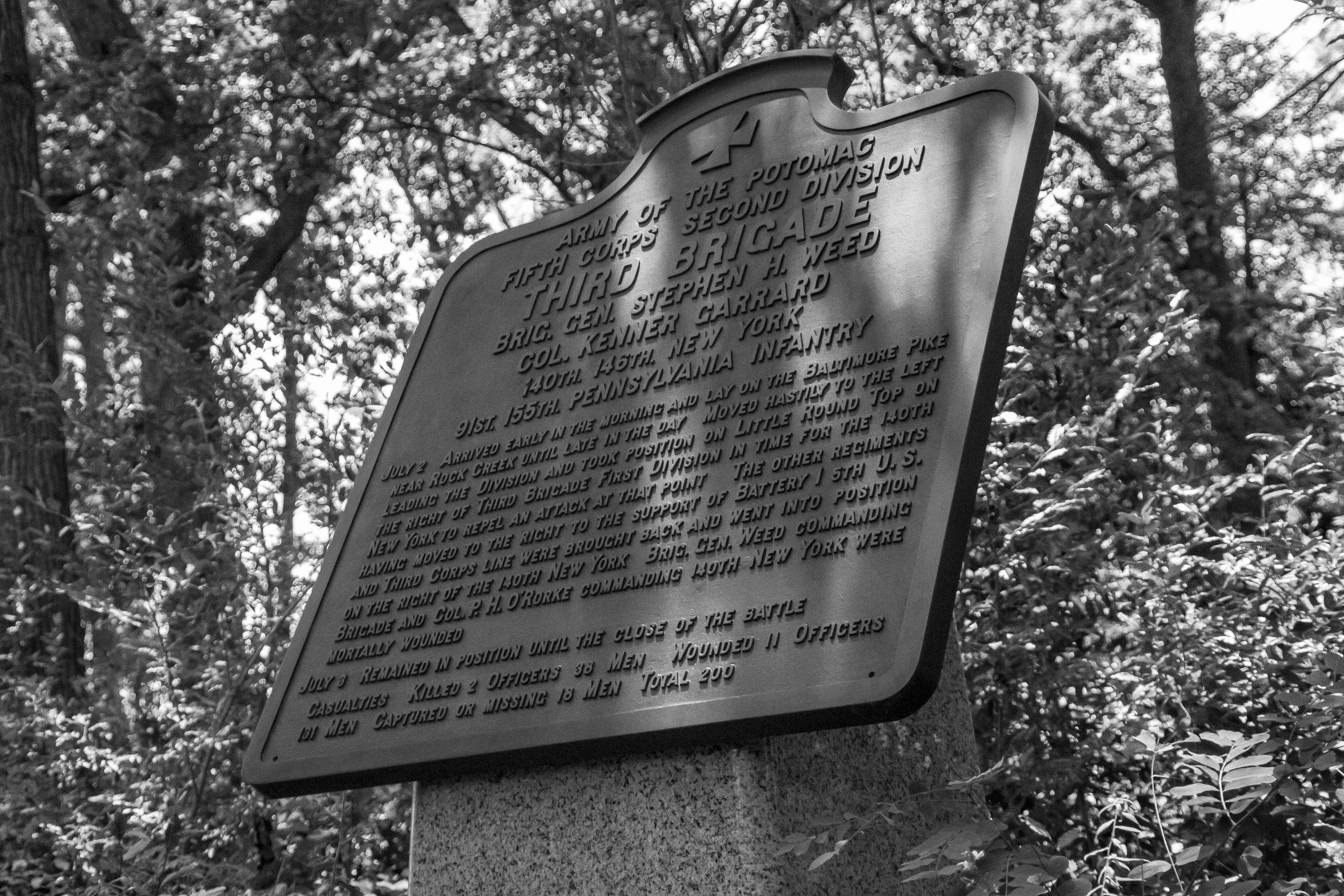 This War Department marker details the movements of the Third Brigade, Second Division, of the Fifth Army Corps during the Battle of Gettysburg. This brigade included the 140th and 146th New York, and 91st and 155th Pennsylvania. Dispatched to the hill on the later afternoon of July 2, they assisted in the repulse of the Confederate attacks.