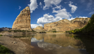 From the view at Echo Park Campground, Steamboat Rock is shaped like a giant shark fin. It looms up over the river from a piece of raised land. Canyons border the scene. The sky, unique rock features, and trees lining the river are all reflected in the calm waters.