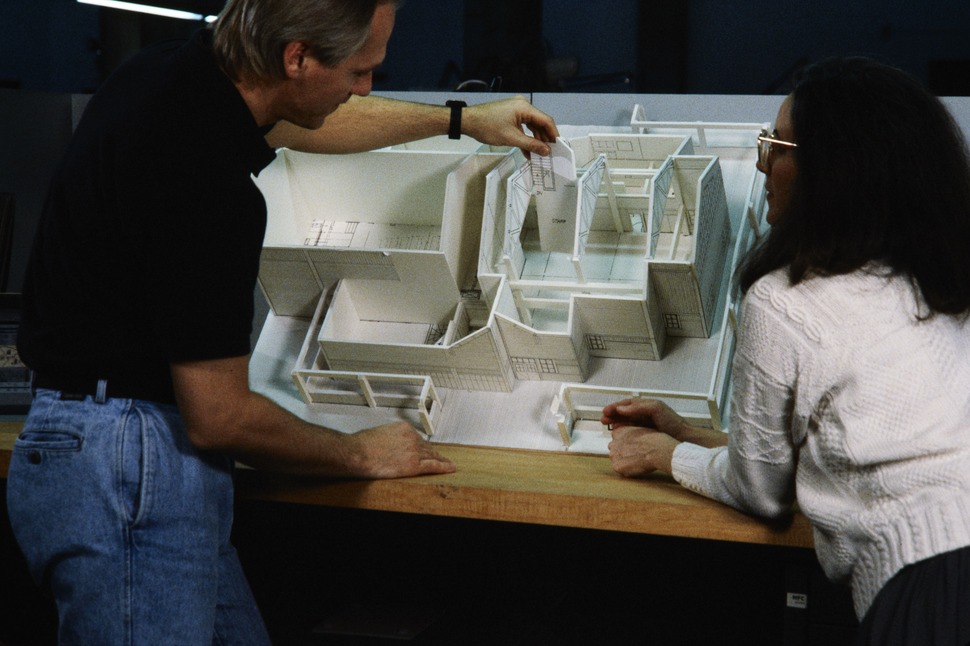 NPS employees Phil Musselwhite and Jane Radford looking at exhibit design.