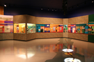 A full color photograph inside a building. The floor reflects some of the overhead lights. In the left side of the frame is a display case with some historical artifacts. Information displays line the walls, but the text is not legible in this photo. On the floor coming from the bottom right of the frame are tiles painted to mimic a map of the Natchez Trace Parkway.