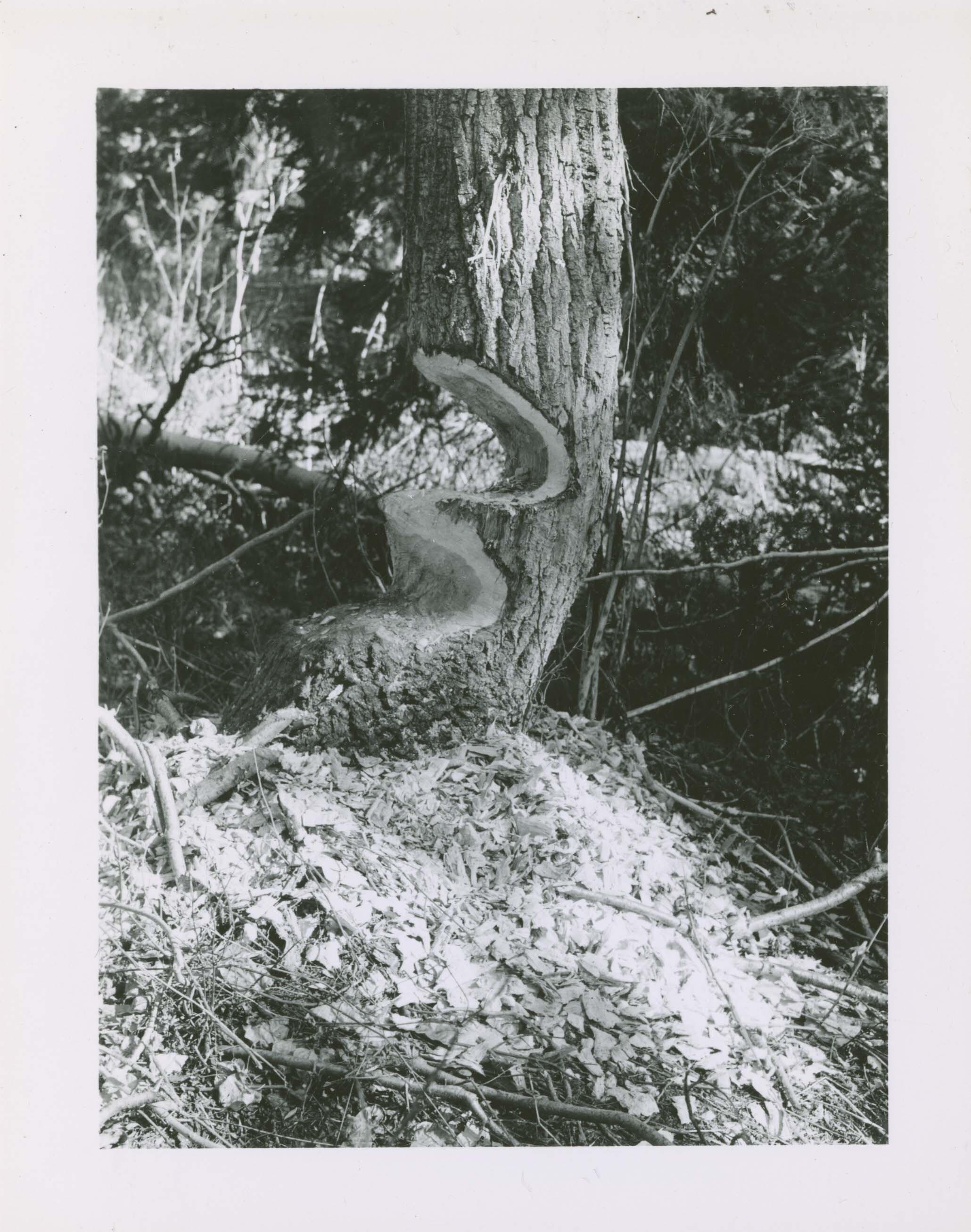 Beaver – Double cut by beaver in trunk of cottonwood. North of Cascade Creek on west shoer of Jenny Lake. Locality: Grand Teton National Park. Negative #: 11182. Location of negative: Biologist’s Office, Director’s Office. [The date and location come from the reverse of the envelope for this negative number.]