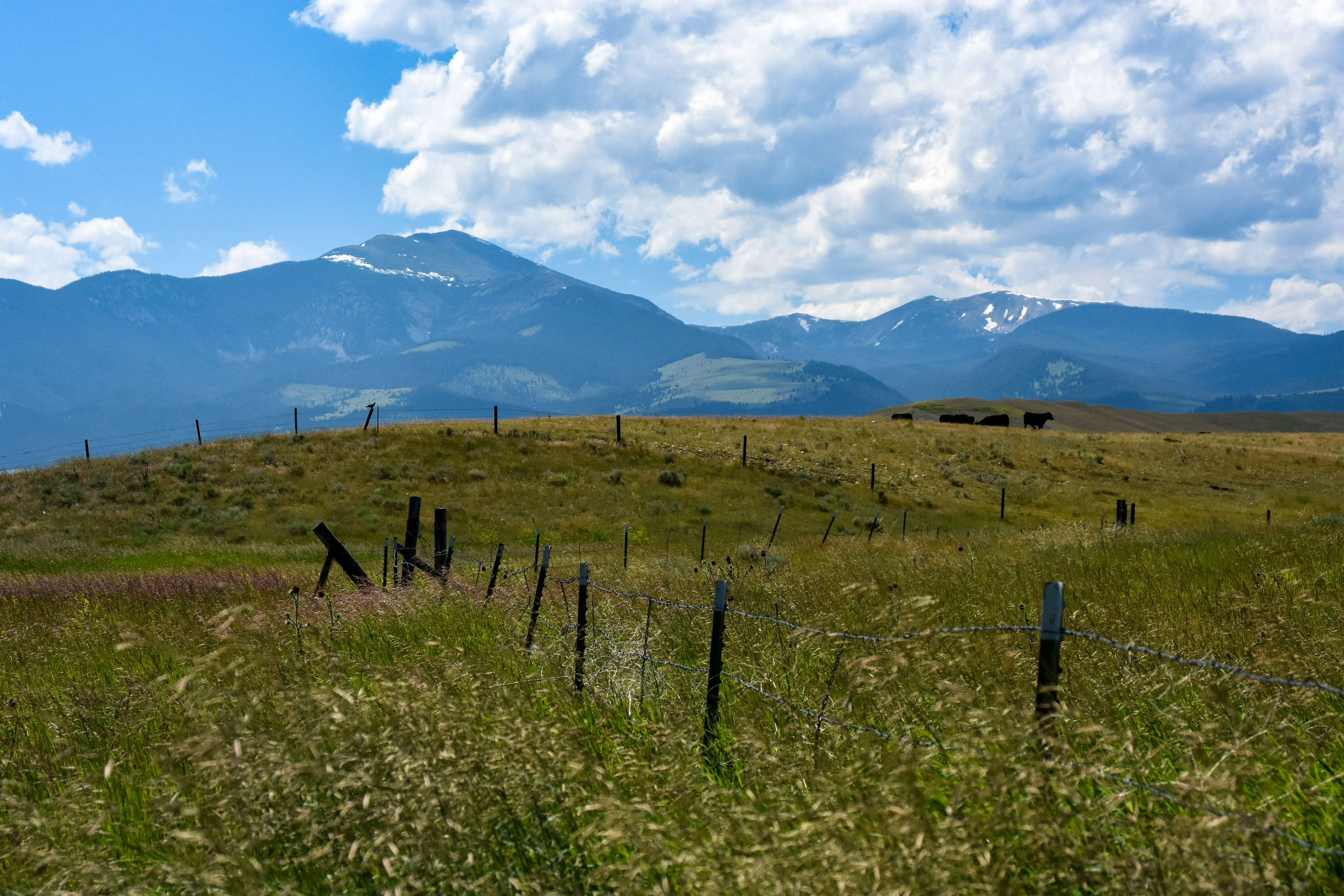 A barbed wire fence winds along the rolling curves of a grassy pasture with mountains rising in the background.