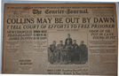 A newspaper with headline “Collins May Be Out By Dawn, 7 Tell Court of Efforts to Free Prisoner” features a photo of 6 men wearing military uniforms near a table, 1 standing and 5 seated.
