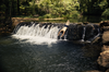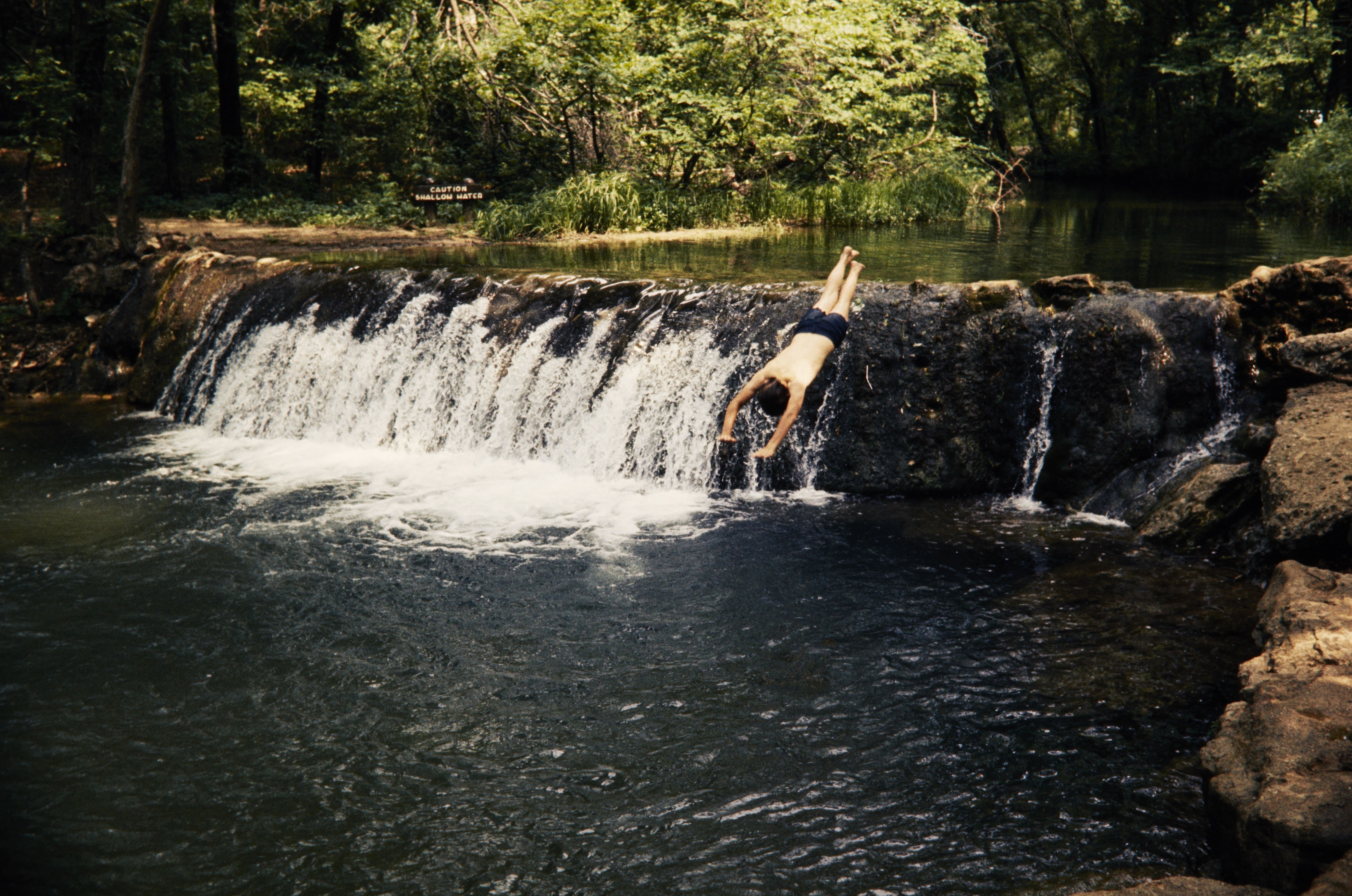 Visitor jumping over a waterfall in Platt National Park now Chickasaw National Recreation Area.