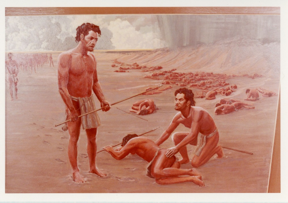 A colored image of people after a battle. Towards the left side of the image there is a man standing holding onto a wooden spear. He is wearing a loin cloth. He has brown curly hair, a short beard, and tan skin. To the right of him is a man lying on the ground with his head turned down in the sand. He is holding onto a wooden spear in his left hand. He has tan skin with brown hair and is wearing a loin cloth. Next to him is a man kneeling down on one knee. His left hand is on the injured man's buttocks and his right hand is on the injured man's right shoulder. He has tan skin, brown curly hair, and is wearing a loin cloth. His spear is located behind him. In the background there are other people in a variety of poses, some of them are sitting or lying down. Beyond the injured is the slope of the coastline. There is gray ash falling from the sky onto the slope. In the far-left background of the image there is a shadow of a group of people walking towards the injured.