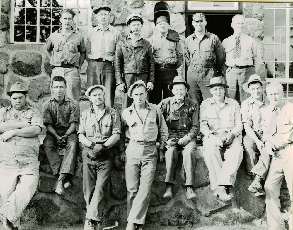 Subject: The Utility Staff - Top - Norm Wimer, Harvey Cliff, ________, Martin Palmer, Clarence Hedgepeth, Charlie Chrysler? Bottom - ______ Dodge, Dick Finch, Dick Varnum, Ray Hale, Charlie Tru, Bill Beckman, Guy Hartell, "Happy" Stradling Photographer: Grant Date Taken: Aug. 18 1941 Remarks: Taken in front of the Warehouse