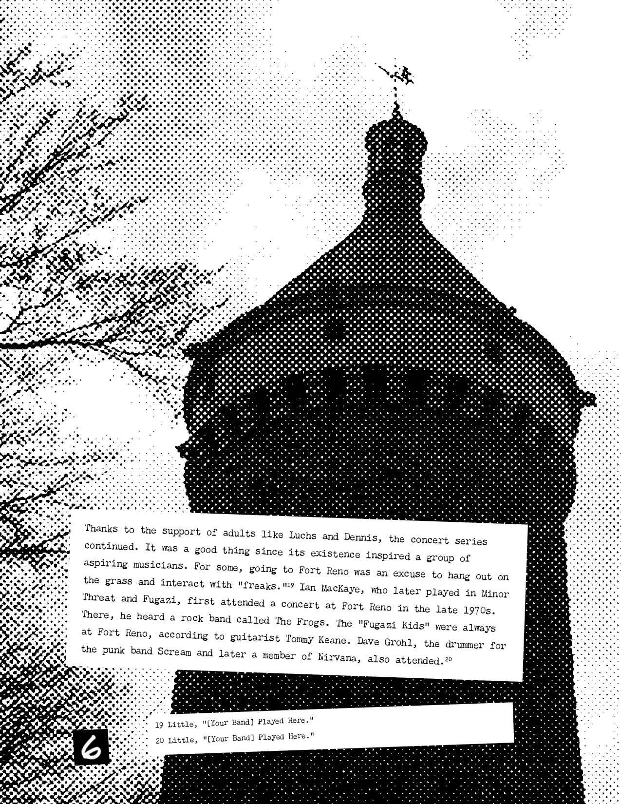 White boxes with black typewriter font. Black and white stippled photo of Tenleytown Water Tower in the background.