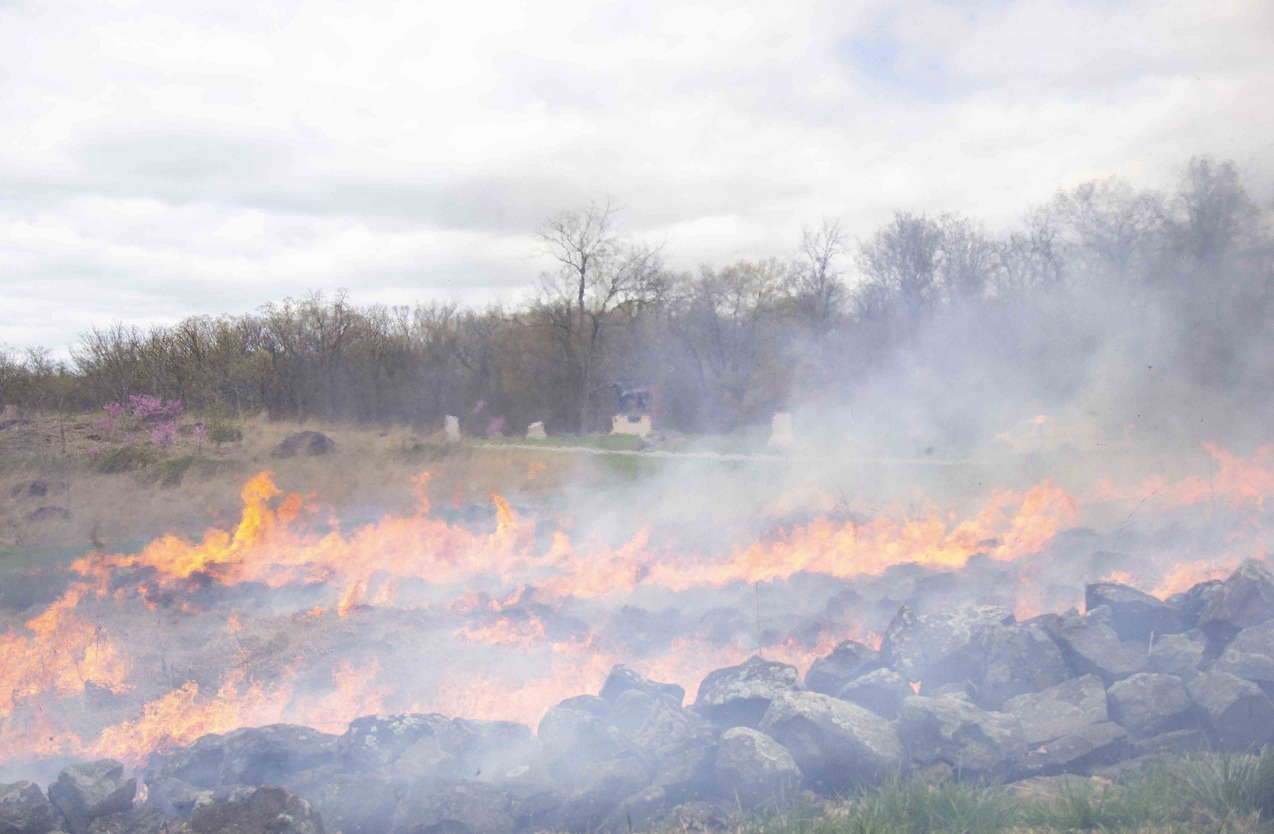 A prescribed fire moves through an open field. A low stone wall runs across the foreground and four monuments line a road through the smoke in the distance in front of a row of trees.
